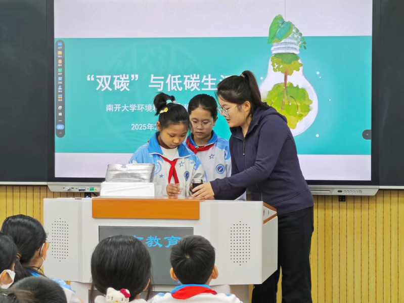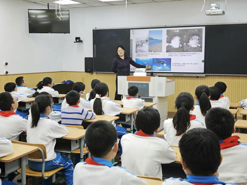 在活动中,志愿者引导同学们认识全球气候变暖的严峻形势、生态环境胁迫案例、极端天气频发及健康潜在危害,随后讲解变暖原因,引入“碳”与二氧化碳概念,并通过干冰升华实验,让同学们直观感受其物质形态与常温相变过程,将“看不见的碳排放”具象化,点燃科学好奇心的同时,为理解“双碳”目标奠定基础。活动中,志愿者结合真实数据与图文资料,带大家追溯“2030碳达峰、2060碳中和”的时代背景与科学依据,明确青少年责任。在低碳生活实践研讨环节,围绕“低碳饮食”“低碳穿衣”、居家节能、绿色出行等场景展开探索,同学们踊跃分享家庭节能妙招,深刻认识到每个人都能成为绿色变革的参与者和推动者。