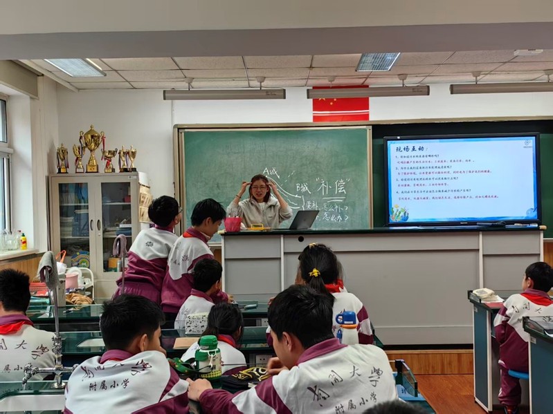 活动中,南开大学环境学院志愿者充分发挥专业优势,通过视频展示、系统讲解与互动提问相结合的方式,将复杂繁琐的水净化过程转化为生动易懂的内容。课堂以“中国水资源分布”为切入点,系统介绍我国水资源“南多北少、东多西少”的总体格局,引导学生认识水资源时空分布的不均衡性;随后结合动画视频,详细讲解污水净化的基本流程,使学生直观理解污水由“浊”变“清”的过程。课堂氛围在多轮互动提问中不断升温,学生参与度高,学习效果显著。