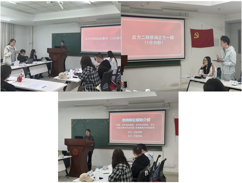 宣讲结束后,两院党员代表围绕“保护地球家园,应对生态危机,应从历史文明中寻找答案/未来科技中寻找答案”展开精彩思辨。正方历史学院代表立足文明兴衰规律,以都江堰生态智慧、工业革命环境代价等史实为例,论证历史经验对当代生态治理的启示意义;反方环境学院代表队则聚焦“双碳”目标与绿色发展前沿,从清洁能源替代、碳捕集利用、生态修复技术等维度切入,强调科技创新是破解生态困局的关键支撑。双方旁征博引,在思想碰撞中尽显学科底蕴,深化了对生态文明建设多元路径的辩证理解,展现了青年党员兼具人文情怀与科学素养的精神风貌。
